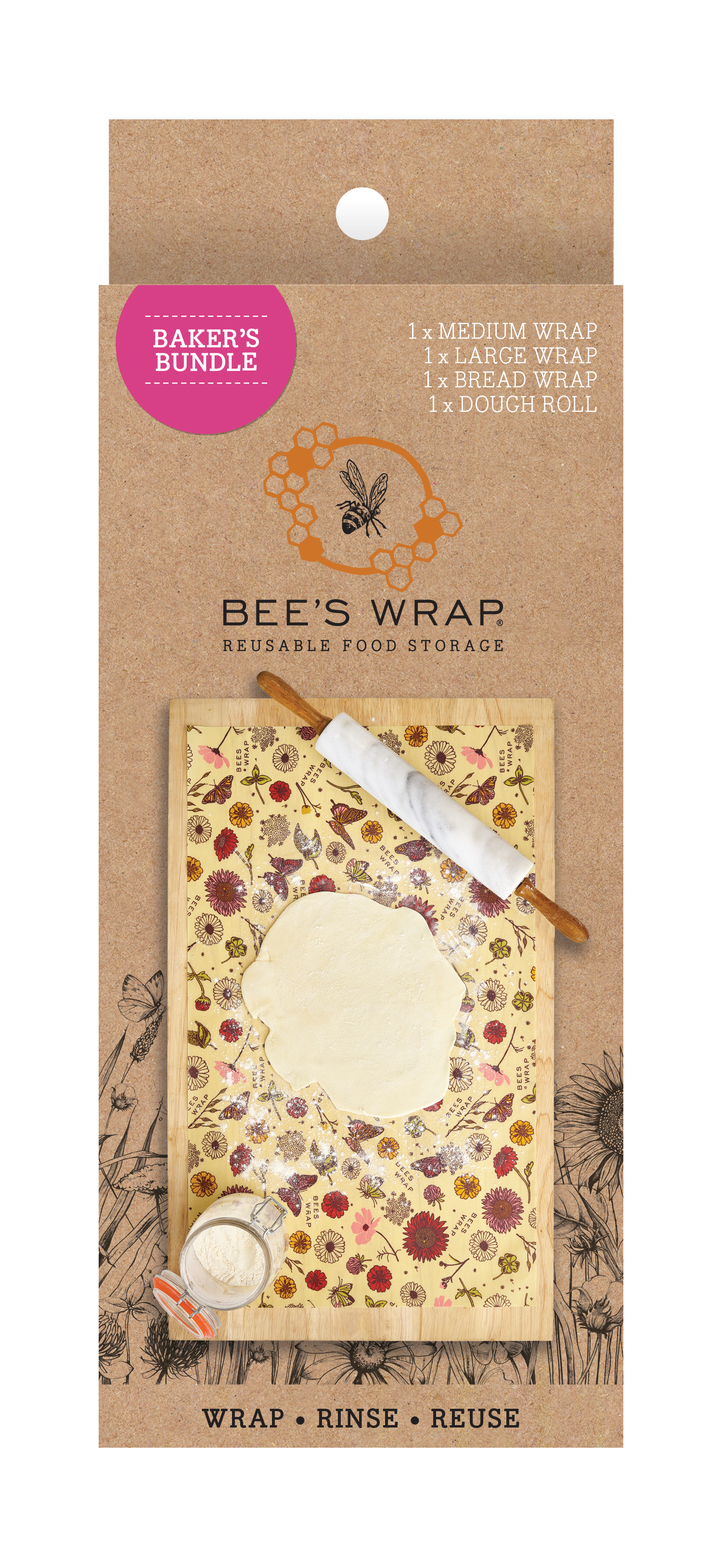 Great gift for hands-on home bakers. Everything a baker needs to prep, proof, and pack treats without plastic. Featuring one medium wrap for covering cookies, one large wrap perfect for bowls and pie dishes, a bread wrap for fresh loaves, and a customizable roll to roll out dough.