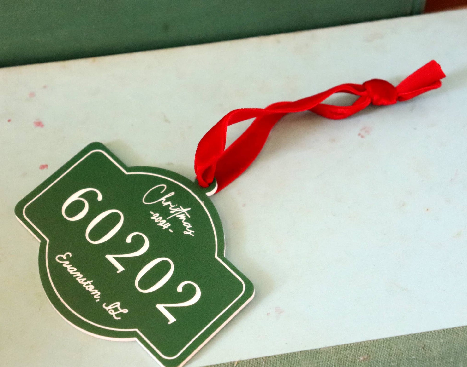 Made of green and white 1/8" acrylic, laser engraved. Red velvet ribbon hanger. The ornament measures 3.25" x 2.75"