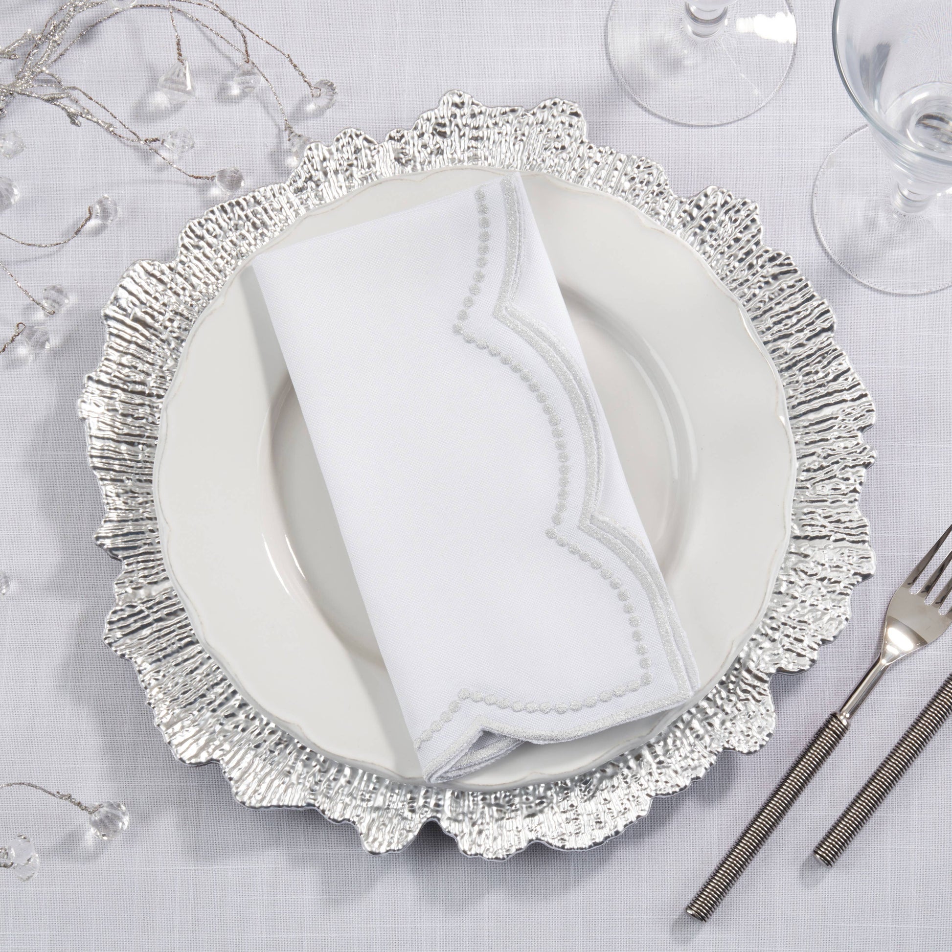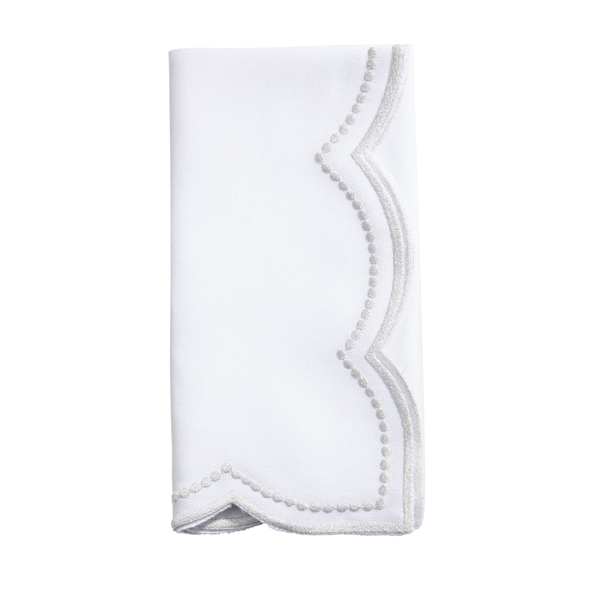 Elevate your dining experience with the exquisite Embroidered Polka Dot Napkins featuring a charming scallop edge. Delicately crafted, each napkin is adorned with intricate embroidery, adding a touch of timeless elegance to any table setting. The playful polka dot pattern infuses whimsy into your gatherings, while the scalloped edges exude sophistication. Perfect for both casual brunches and formal dinners, these napkins are sure to impress your guests and elevate any occasion. Make every meal a special one with the Embroidered Polka Dot Napkins.