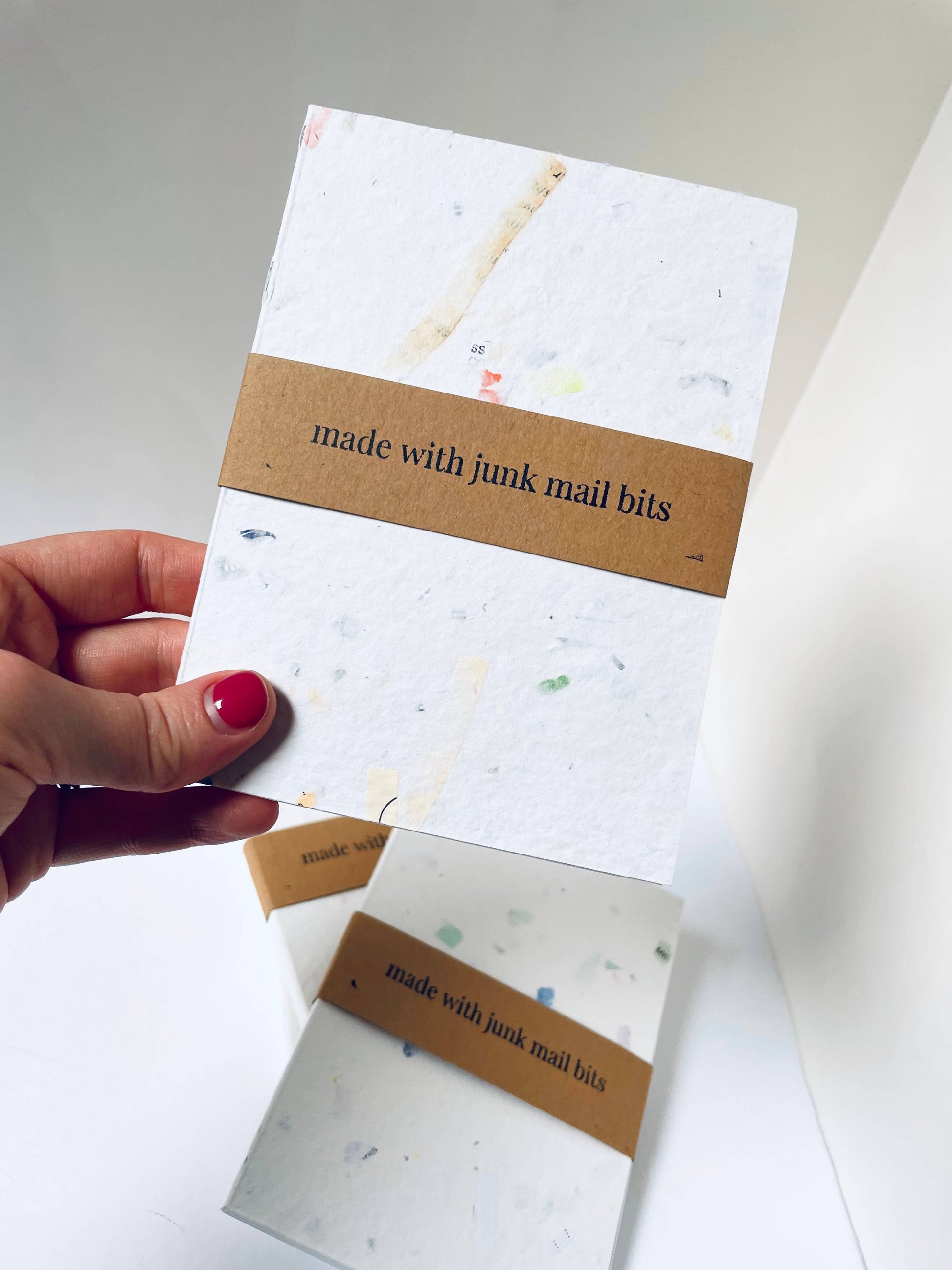 These notebooks are truly one of a kind made from special Junk Mail paper. Sourced from a small mill in California, their staff collects unwanted junk mail and mixes it with recycled paper to make each sheet unique. Each one is handcrafted into the perfect notebook for those everyday things! This product has a blank front cover.