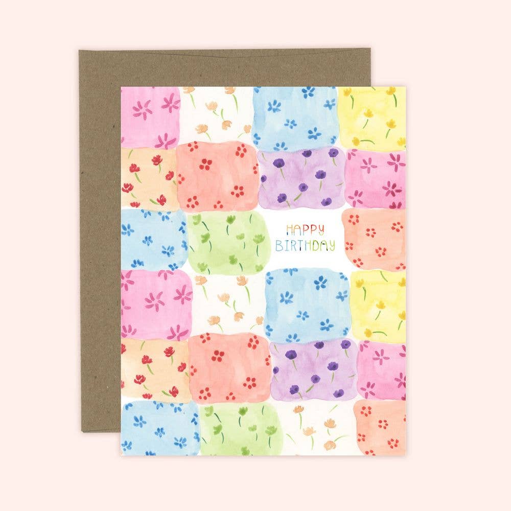 An array of watercolor floral patchworks graces this sweet happy birthday card. Perfect for children or adults that revel in the delicate, sweeter tones of life.